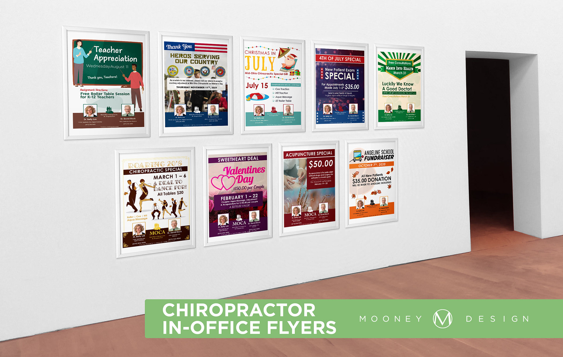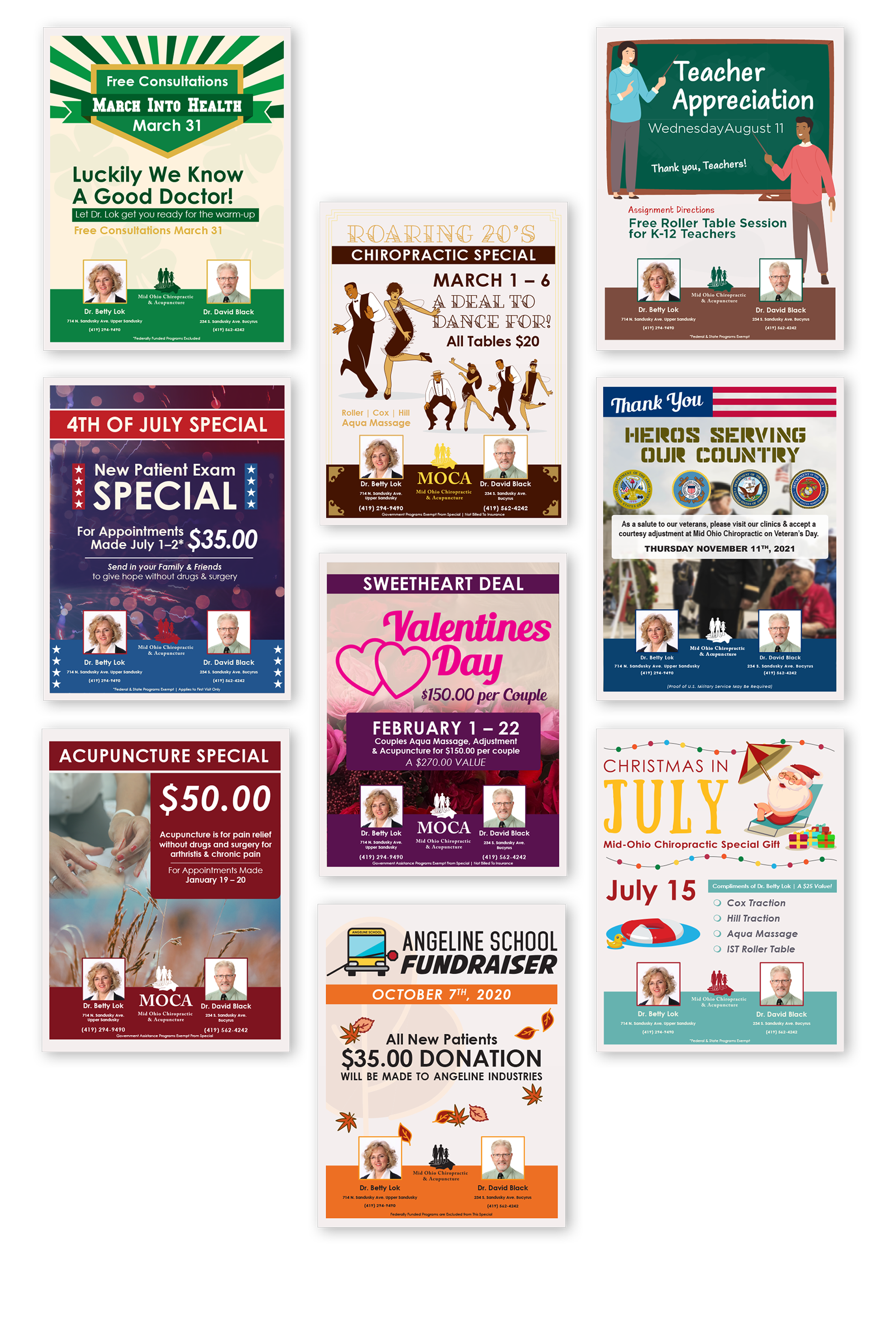Various flyers for in office use to promote upcoming and current promotions for the office from month to month throughout the year.